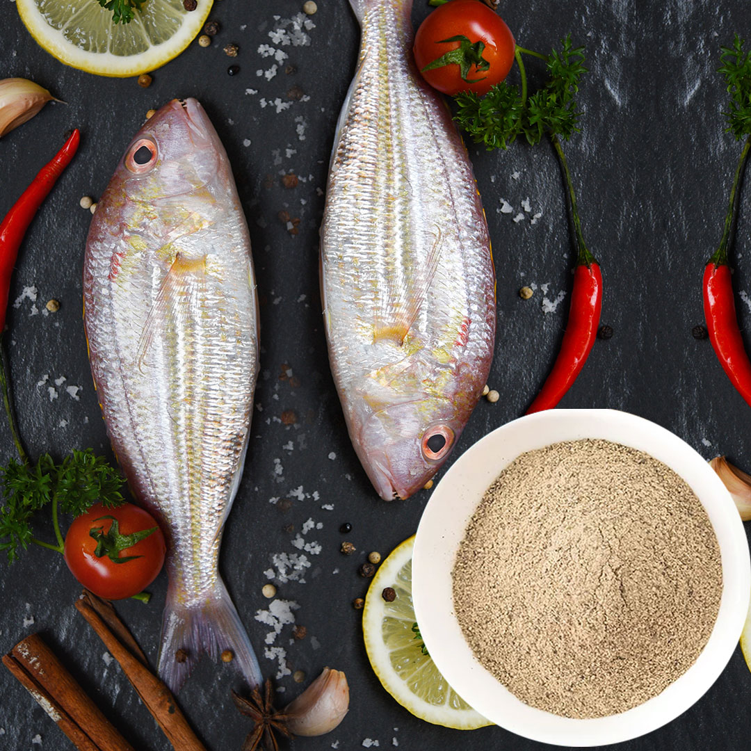 Hydrolysed Fish protein blended with food chemicals producing a strong fish flavour.